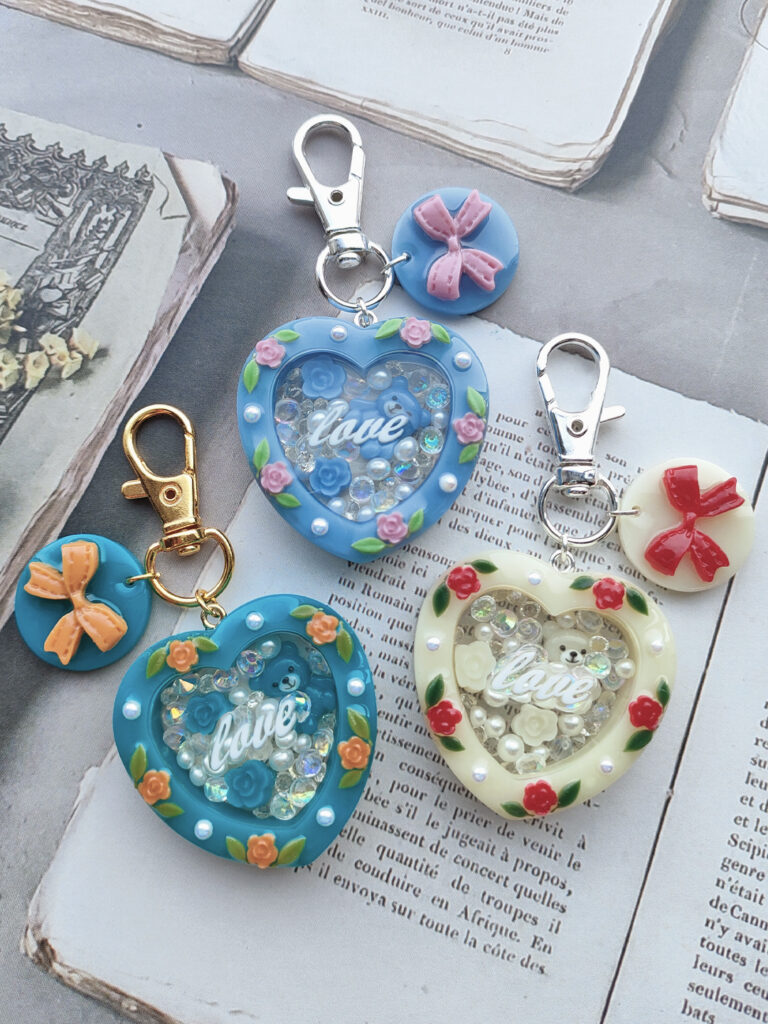 このモールドで、中のパーツがシャカシャカ動くかわいいマル型のキーホルダーアクセサリーがつくれます。