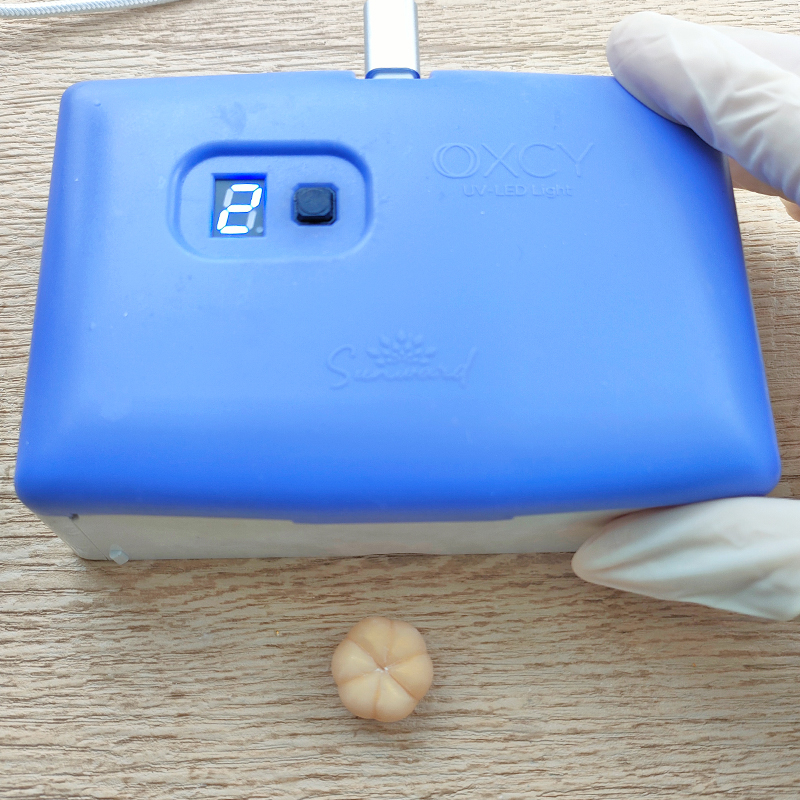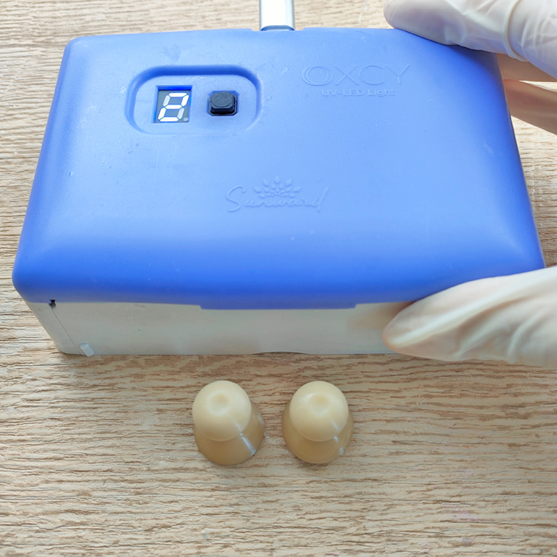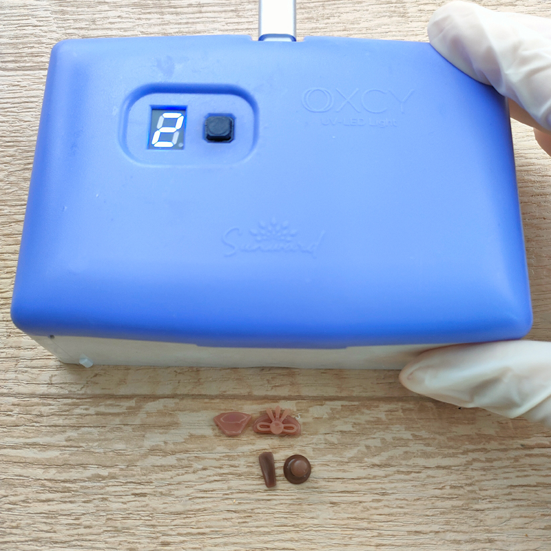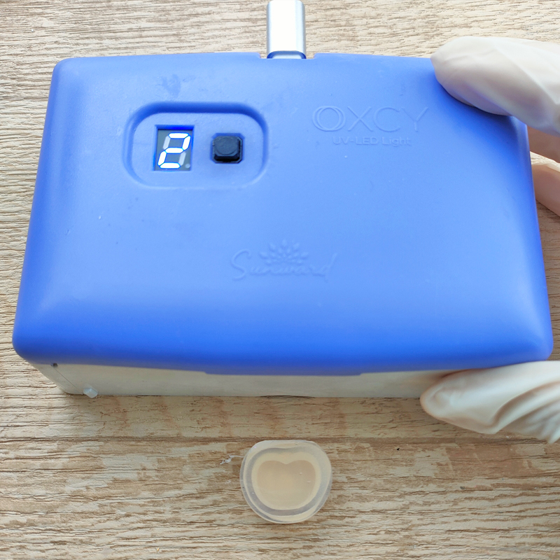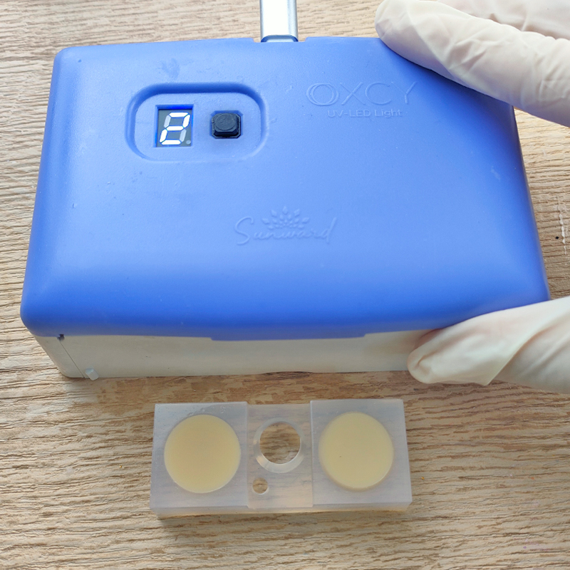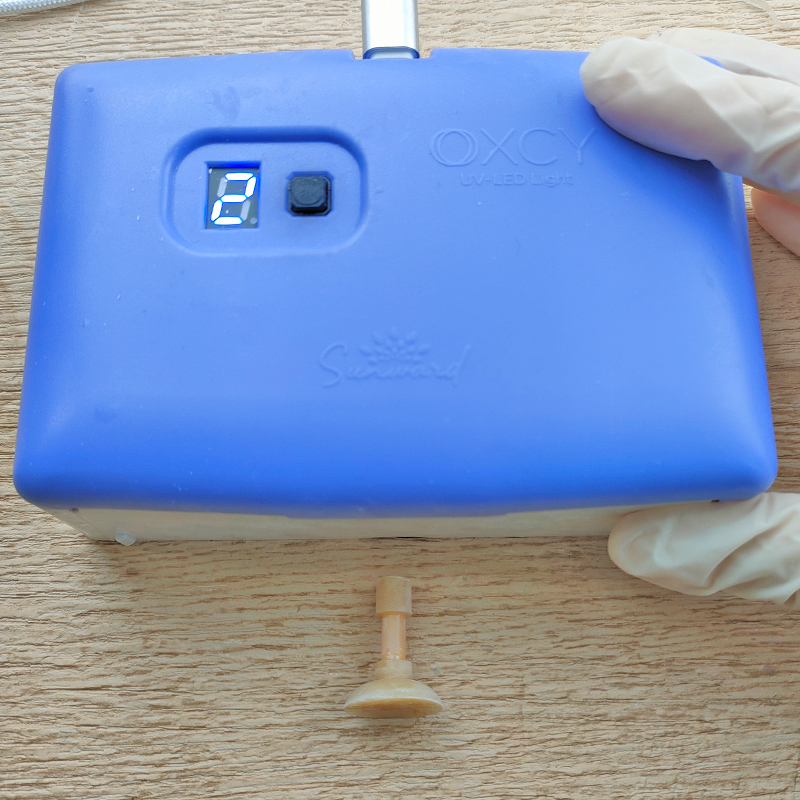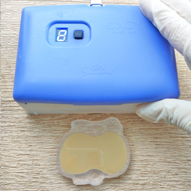 表面をしっかり硬化させた後に、モールドを裏がえして裏面もしっかり硬化せます。