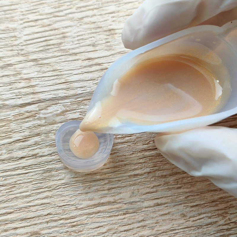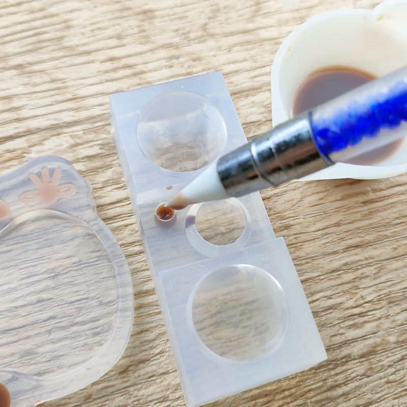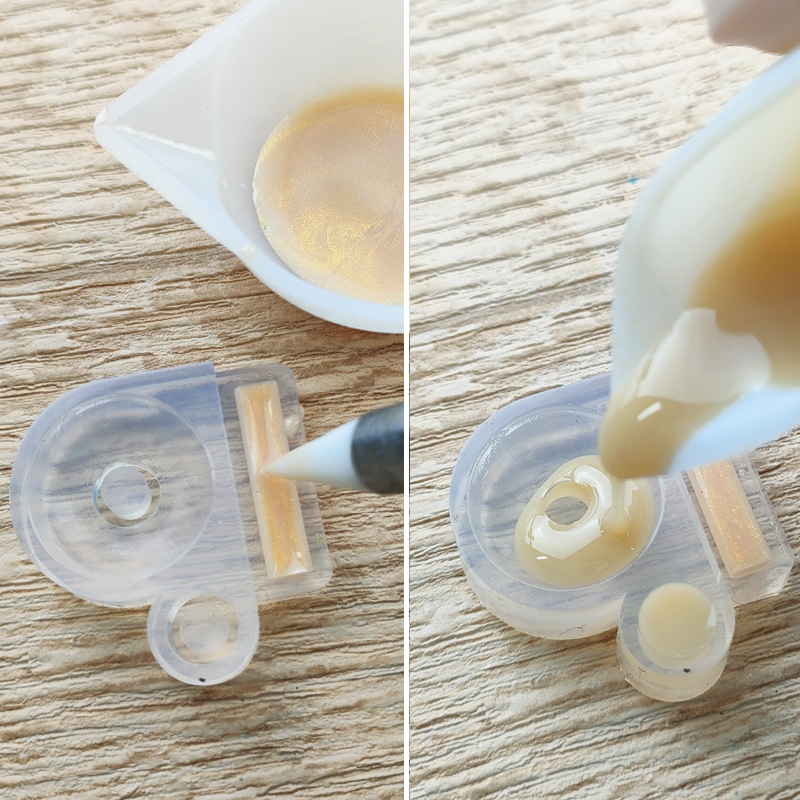 着色剤とOXCY UV-LED Resinを混ぜ合わせたUVレジンをモールドの半分まで流します。
